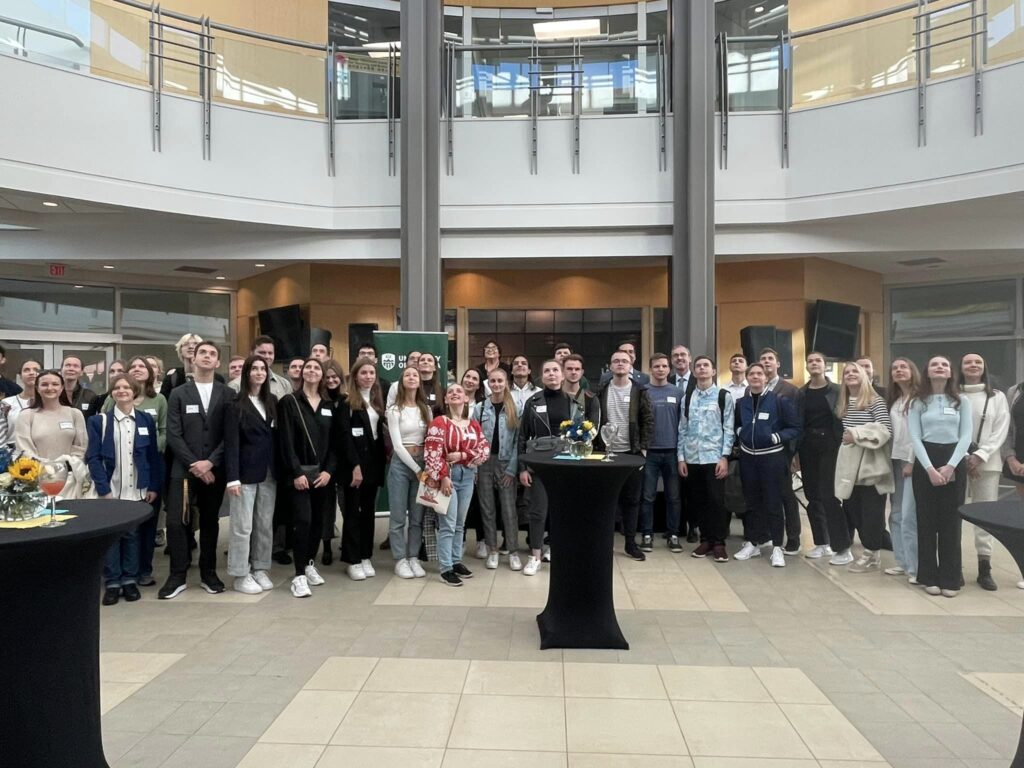 Альбертський університет прийняв 80 студентів з України, надавши їм можливість безкоштовно вчитися. Ще кілька десятків добираються. Автор цієї ініціативи – Президент університету Bill Flanagan. На фото – прийняття на честь українських студентів в університетському міжнародному центрі Telus. На події виступив Генеральний консул України в Едмонтоні Олександр Данилейко.