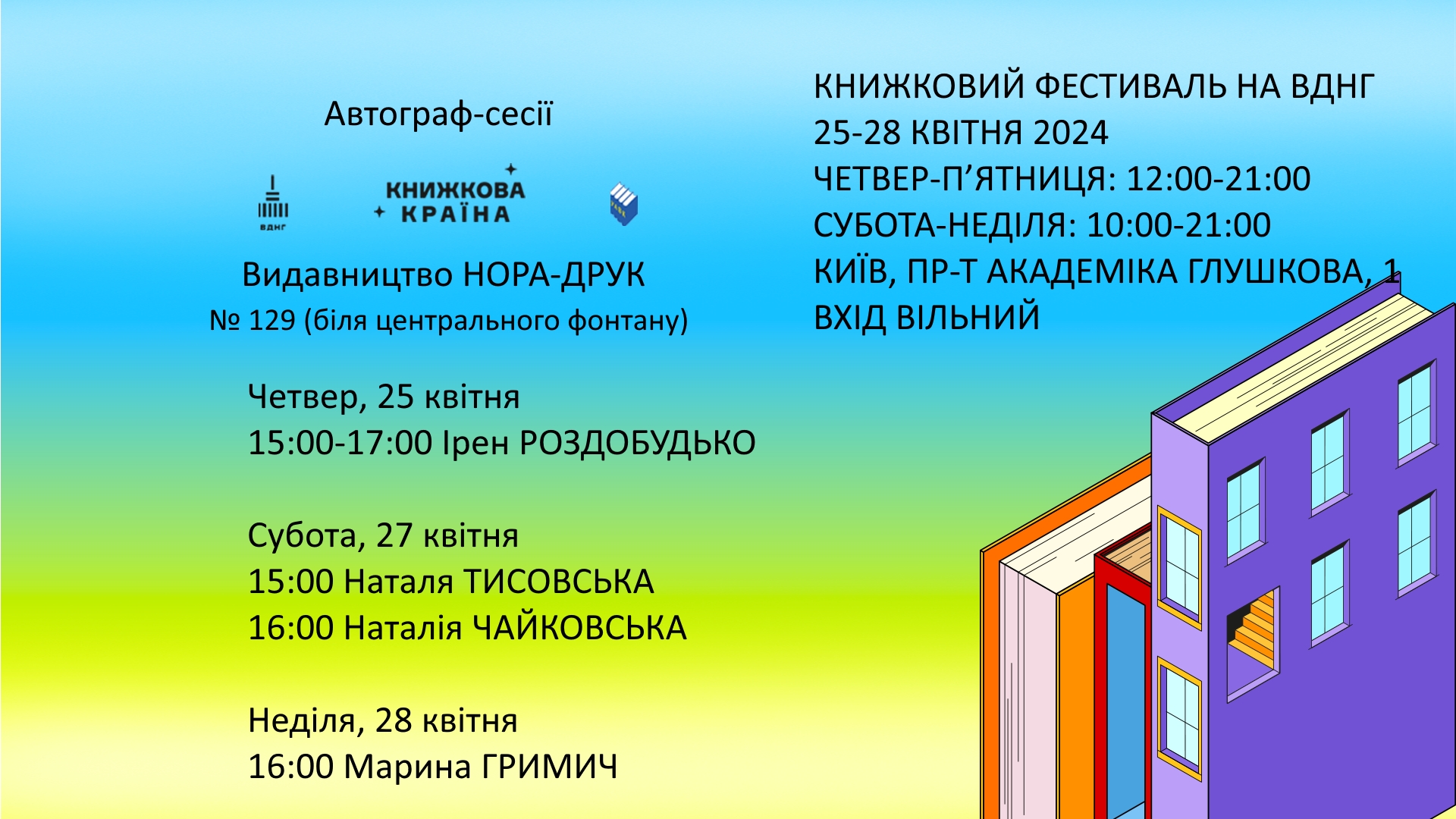 Видавництво НОРА-ДРУК запрошує на автограф-сесії письменників, які проходитимуть під час фестивалю “Книжкова країна” на ВДНГ (Київ, пр. Глушкова, 1): 25 квітня 2024, Ірен РОЗДОБУДЬКО 15:00 – 17:00 27 квітня 2024, Наталя ТИСОВСЬКА 15:00 27 квітня 2024, Наталія ЧАЙКОВСЬКА 16:00 28 квітня 2024, Марина ГРИМИЧ 16:00 Намет № 129 (біля центрального фонтану)